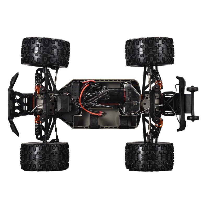 Повдигнатото найлоново шаси с алуминиеви предпазни плочи отпред и отзад осигурява изключителен контрол и механична издръжливост. Окачване с шарнирна система, алуминиеви амортисьори, пълни с масло, и висококачествени сачмени лагери осигуряват изключителна производителност, независимо дали сте извън пътя или на улицата. Предната и задната броня абсорбират ударите ефективно, а LED светлинната лента на покрива и задните светлини добавят впечатляващ външен вид и подобрена видимост.