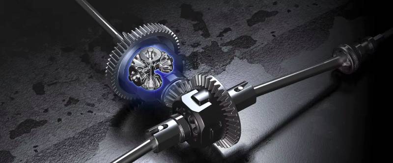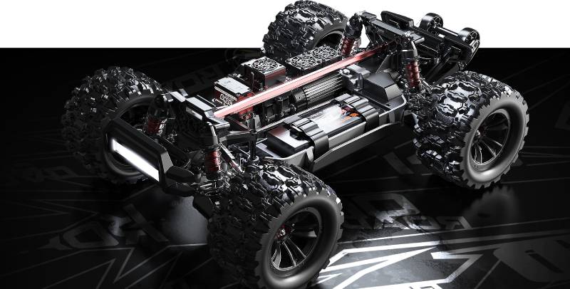 Автомобилът разполага с метални маслени амортисьори с регулируема твърдост и здрави гумени гуми, осигуряващи отлична стабилност и сцепление на различни терени. Снабден е с три диференциала (преден, централен и заден) с метални корпуси, които разпределят мощността равномерно и предпазват зъбните колела при екстремни условия.