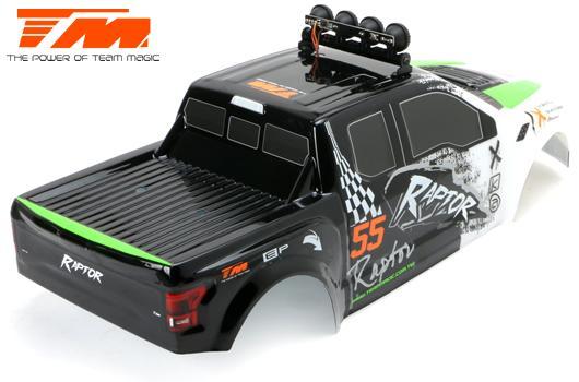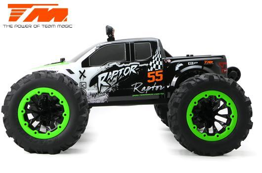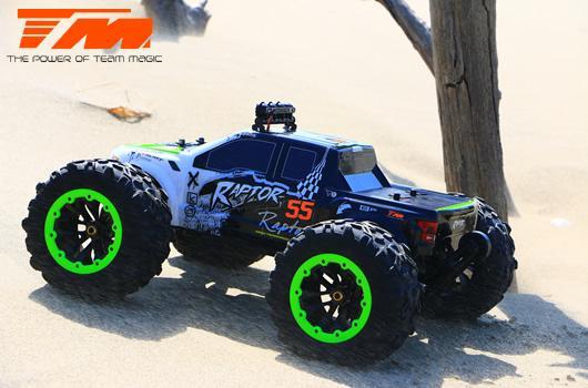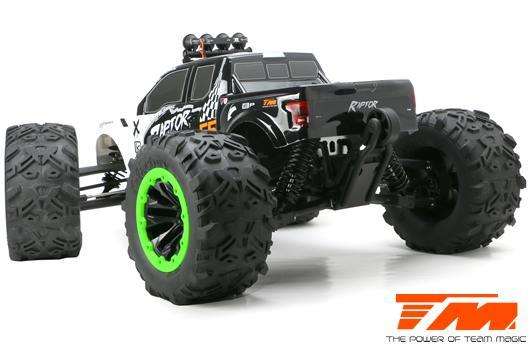 TEAM MAGIC E6 Raptor е хищникът сред чудовищните камиони в мащаб 1/8. В зависимост от батерията (4 или 6s LiPo) и гумите могат да се постигнат максимални скорости до 90 км/ч. Яркият LED бар на покрива превръща нощта в ден, за да можете безопасно да хвърчите дори на тъмно.