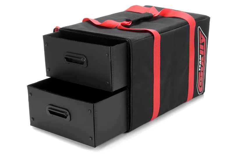 Чантата за носене Team Corally е изработена, за да издържи на износване и всички пътувания до и от пистата и извън нея. Самият калъф е изработен от издръжлив найлон, достатъчно дебел, за да устои на разкъсване и ежедневна употреба. Логотата на фабричните отбори, отпечатани чрез ситопечат, са част от цялата чанта.