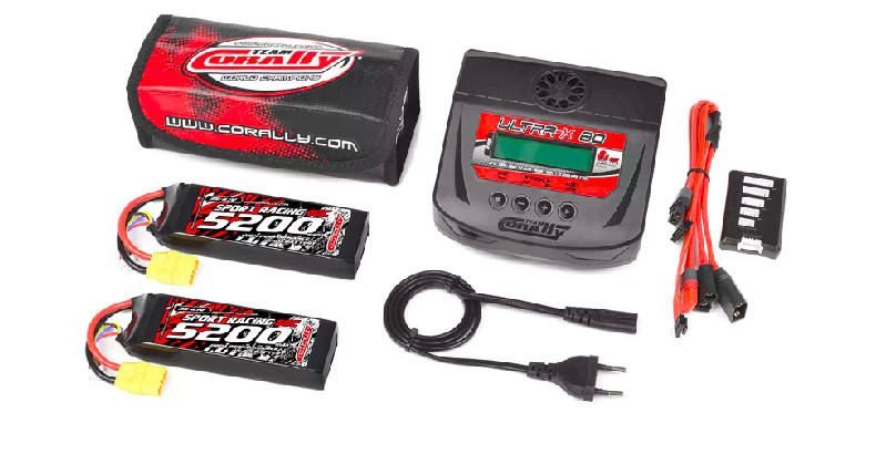 Начало Батерии Team Corally – Energy Pack – 2X Lipo 60C 5200MAH 3S XT-90 + Ultra-X 80 1-6S AC/DC Charger + Lipo Safety Bag + Charge-Balance Lead