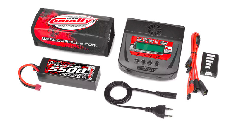 Team Corally – Energy Pack – Lipo 60C 5500Mah 3S T-PLUG Hard Case + Ultra-X 80 – 1-6S AC/DC Charger + Lipo Safety Bag + Charge-Balance Lead
