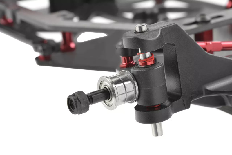Две композитни странични рамена, алуминиева централна панта и внимателно планирана геометрия осигуряват плавно и прецизно движение в задната част. Тази класическа конфигурация е доказано надеждна за състезания в мащаб 1:12. Плътна ос: Модерните писти в мащаб 1:12 често имат високо сцепление, което прави плътната ос най-доброто решение. Тя е лека, неизискваща поддръжка и осигурява лесно прехвърляне на мощност.